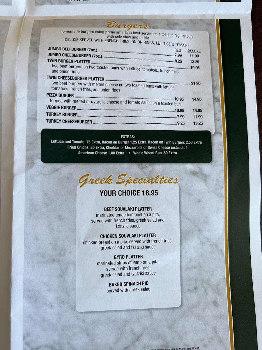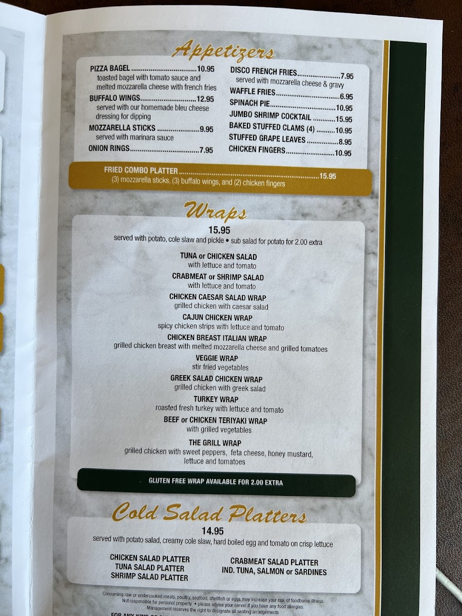 For lunch or a light dinner, the menu unfolds with a variety of wraps, including options like chicken Caesar, Cajun chicken, and veggie wraps, alongside Greek specialties such as beef or chicken souvlaki and gyro platters. These offerings bring a subtle international twist while still keeping the meal approachable and satisfying.