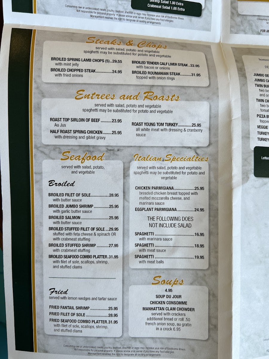 Seafood options like broiled filet of sole and the rich muscles marinara pasta add a touch of variety that suits the unhurried, welcoming environment. The pacing of the meal here encourages simple enjoyment over rush, fitting well with the steady service and comfortable setting.
